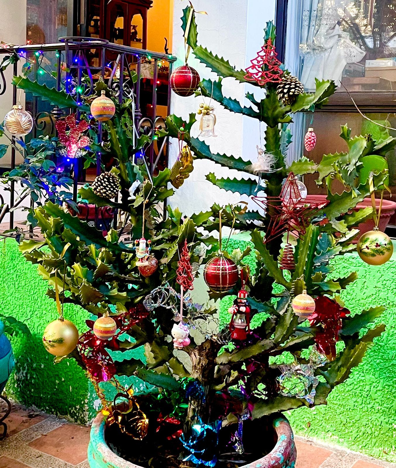 I loved thinking idiosyncratically about Christmas. I was an outsider who felt welcomed. My favorite part happened to be the tree. There was something wonderful about having it indoors, how it would make home smell of pine. I loved conventional ornaments as well as weird ones. When we moved to Mexico, in place of a tree, we decided to switch over to our Christmas cactus (see again photo above). It’s different, with the same silly spirit.