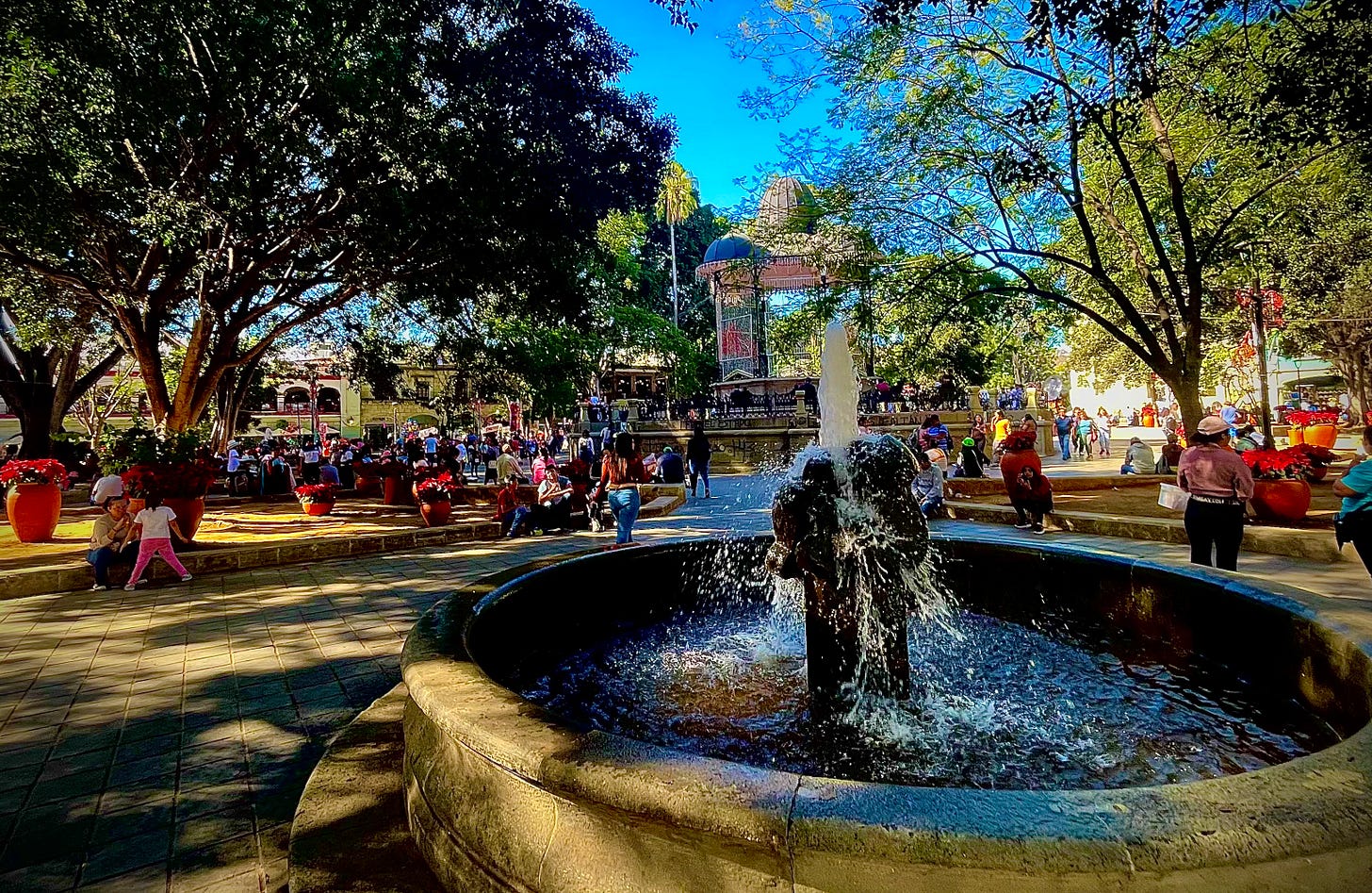 So why go there? One because the Zócalo can be lovely, with its band shell, its benches and trees, the gardens. With shops and restaurants on two sides, government offices on the third, and the metropolitan cathedral on the fourth, it’s always humming with activity, full of people, vendors, street musicians of all kinds. Right now it’s been decorated for Christmas. At its heart, Oaxaca remains a sleepy kind of town, one that closes early at night, even on the weekends. The Zócalo, though, always feels alive, no matter the time of day. It can be quite the show.